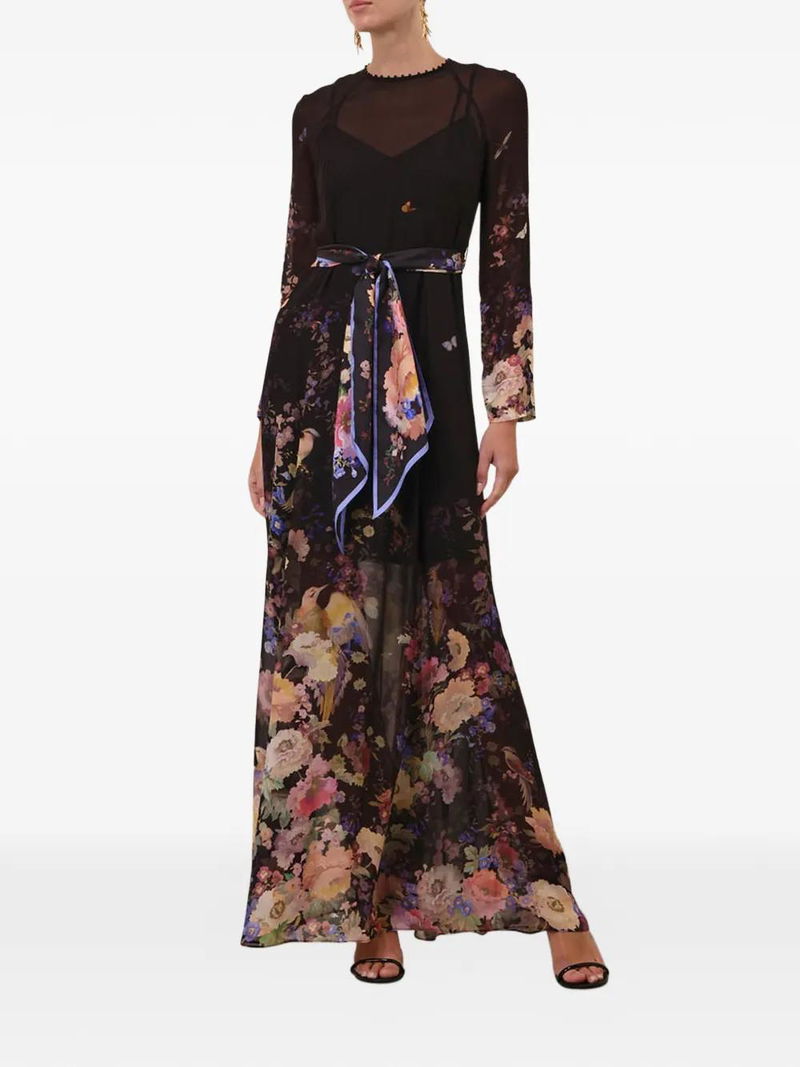 Black floral print sheer panels belt detail long sleeves gathered detailing.