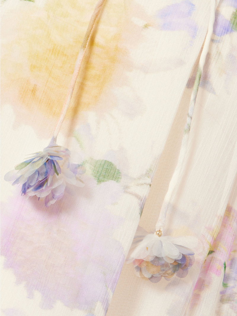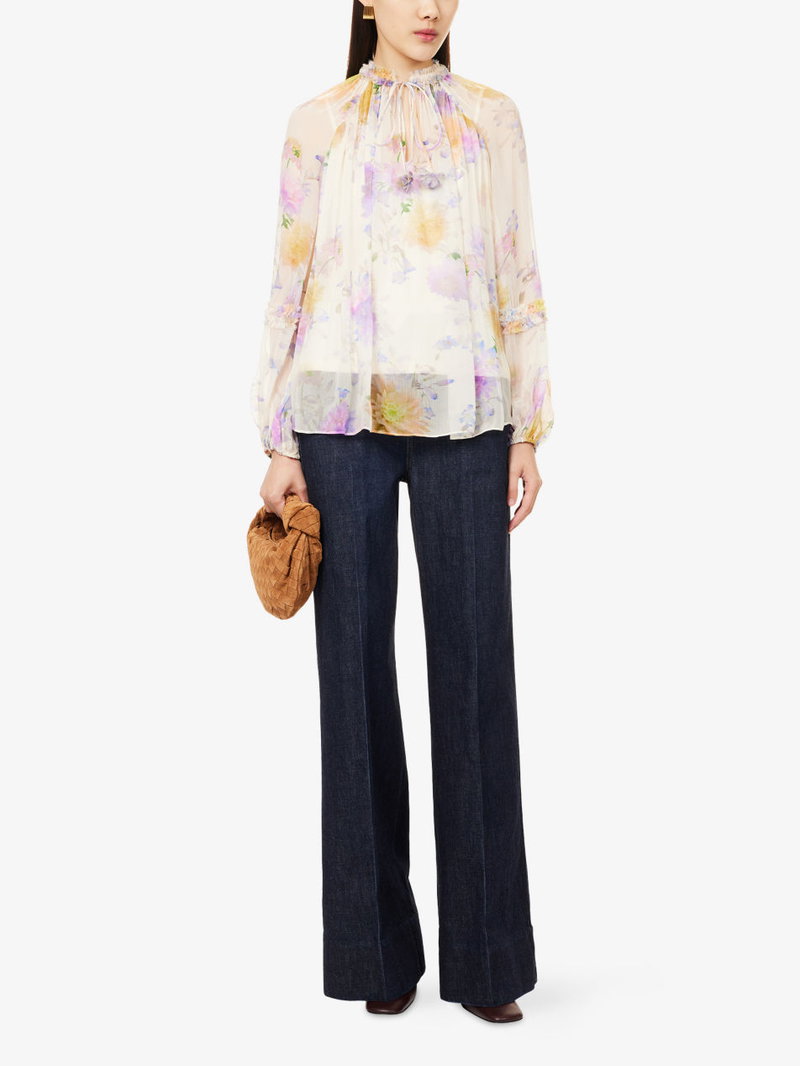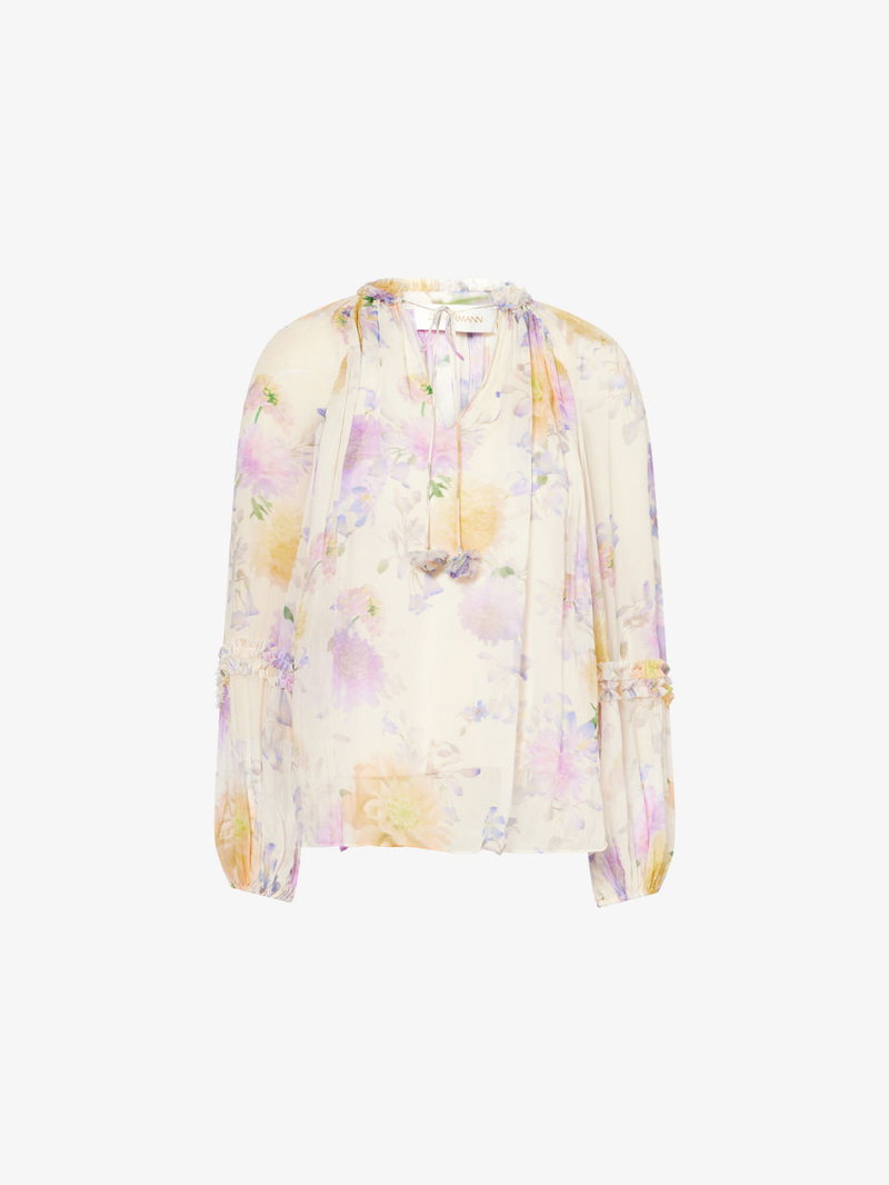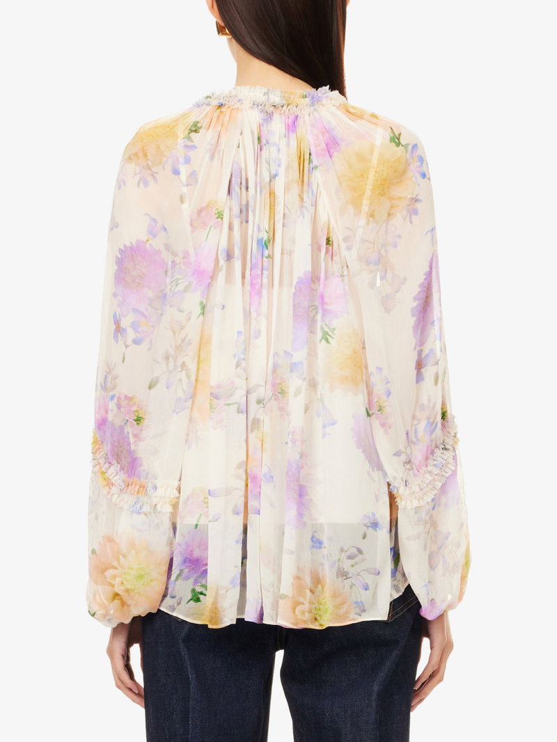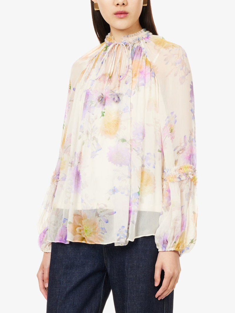 • Billowy fit, self-tie ruffle collar, long raglan sleeves, elasticated cuffs, all-over floral print, sheer, slip lining