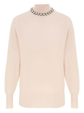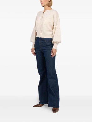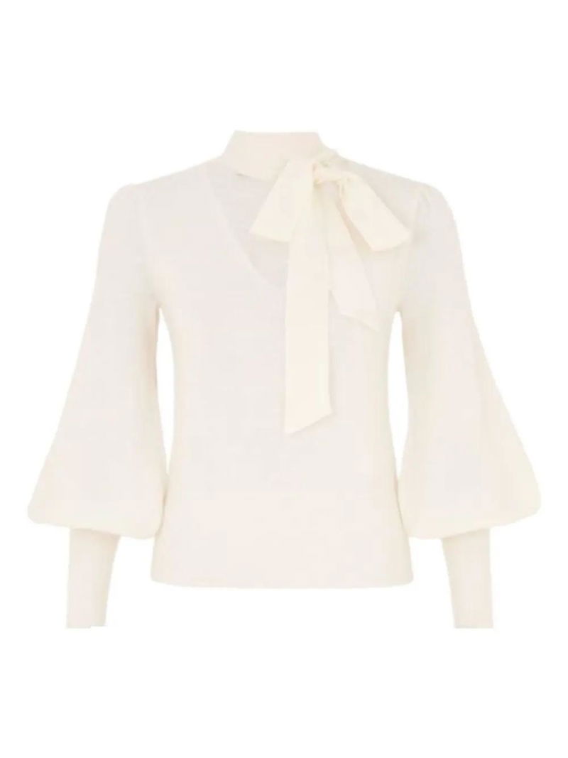 Light beige, balloon sleeves, neck tie, ribbed hem.