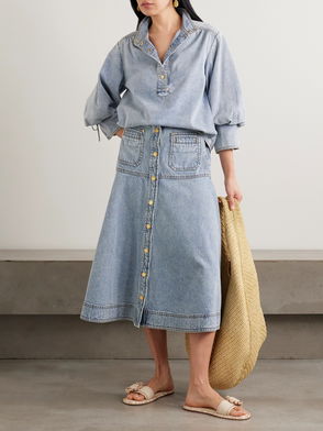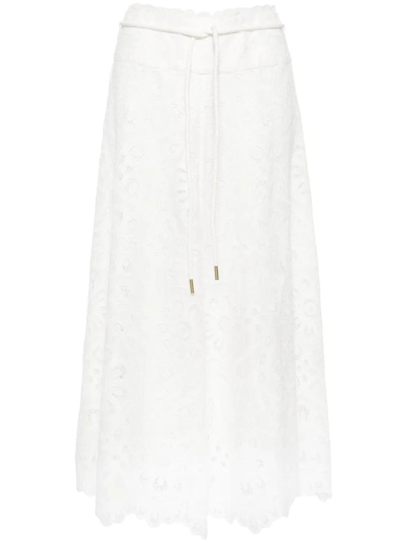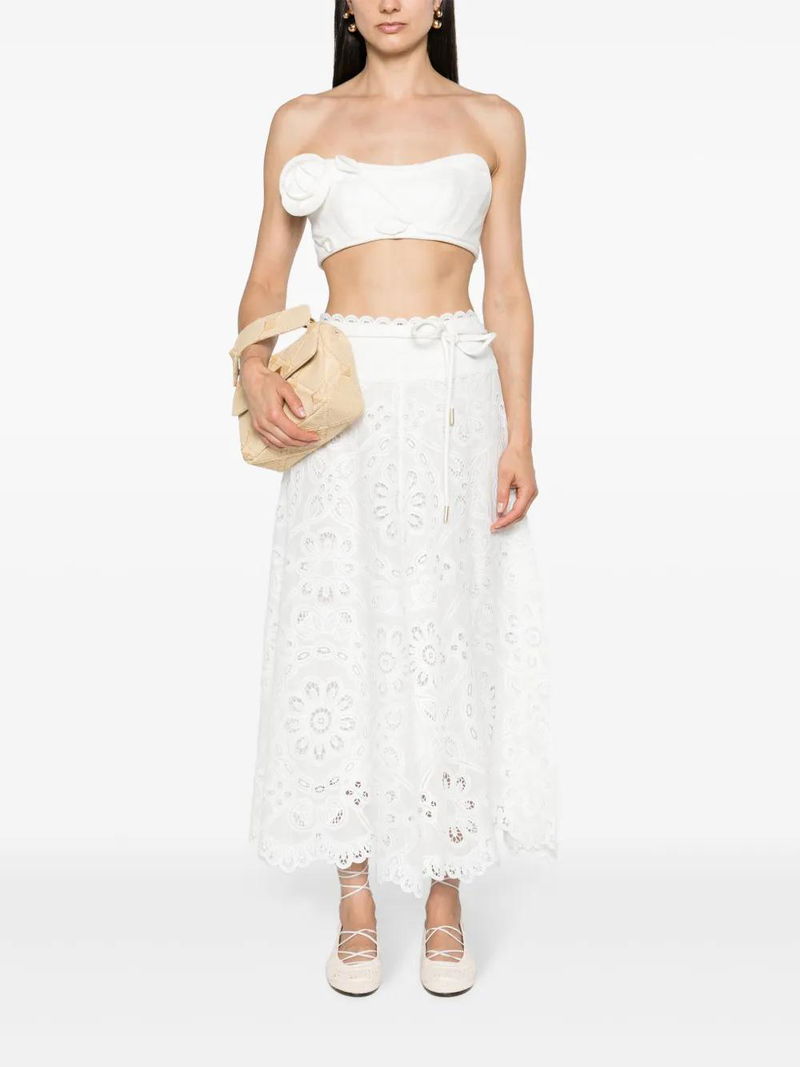 Ivory white, cotton broderie anglaise, belted waist, concealed rear zip fastening, flared skirt, scallop hem, mid-length.