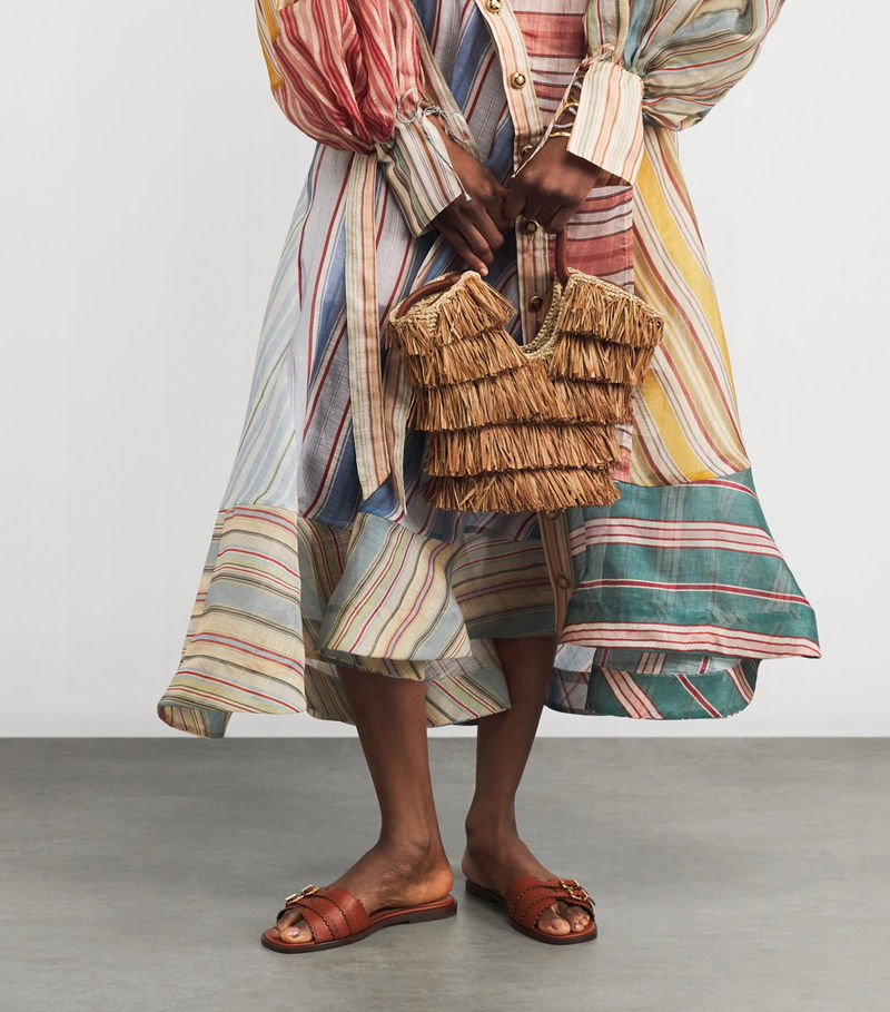 Meticulously handwoven from raffia in Madagascar, Zimmermann's Goldentime tote bag, as its name aptly suggests, is made to be the perfect essential for the summer season. Adorned with hand-cut fringes, the silhouette artfully nods to surfing styles and natural shapes found at the seashore, while its tubular handle is fitted with hardware inspired by surfboards.