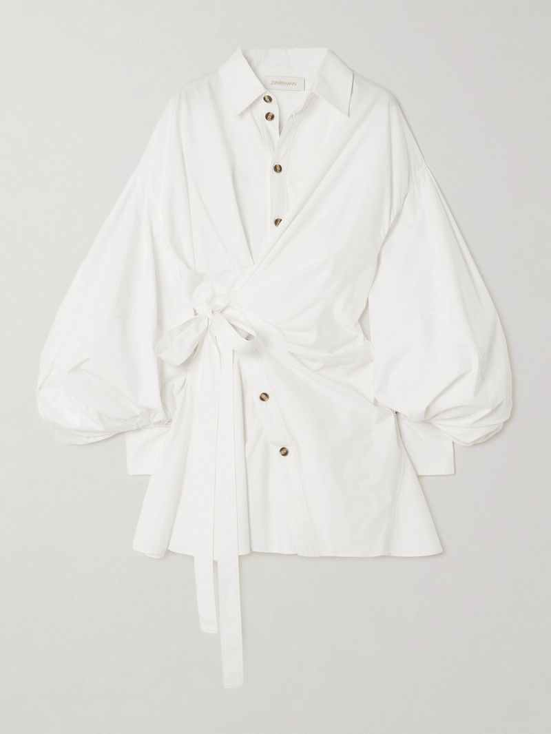 Riffing on the subversive spirit of Zimmermann's 'Twisted Romance' Resort '26 collection, this 'Rebellion' mini dress is cut to an asymmetric profile from crisp cotton-poplin and tightly gathered at the wrap-effect front. Dramatic puffed sleeves work to contrast the cinched waist.