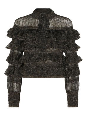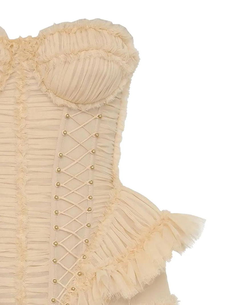 Cream ruffled trim eyelet detail frayed edge pleated detail.