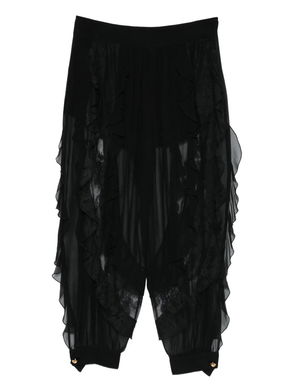 Peach lace detail, ruffled trim, buttoned cuffs, sheer finish, elasticated waistband.