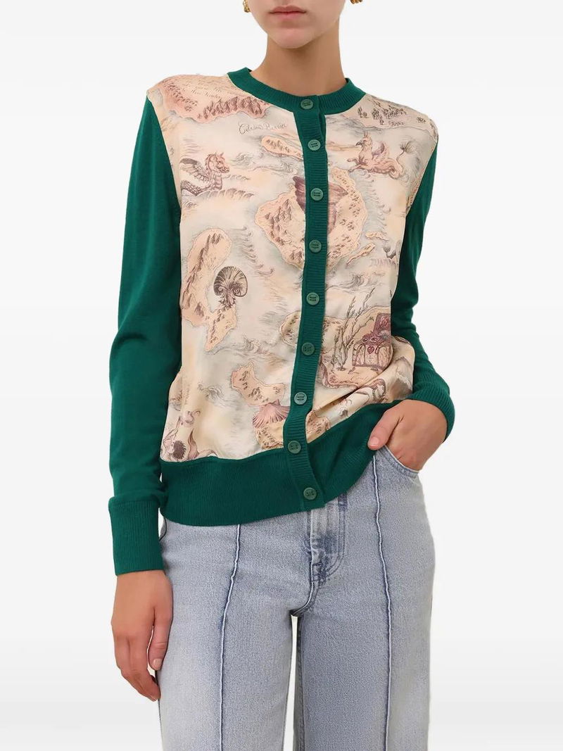 Green/beige button fastening round neck long sleeves ribbed trims.