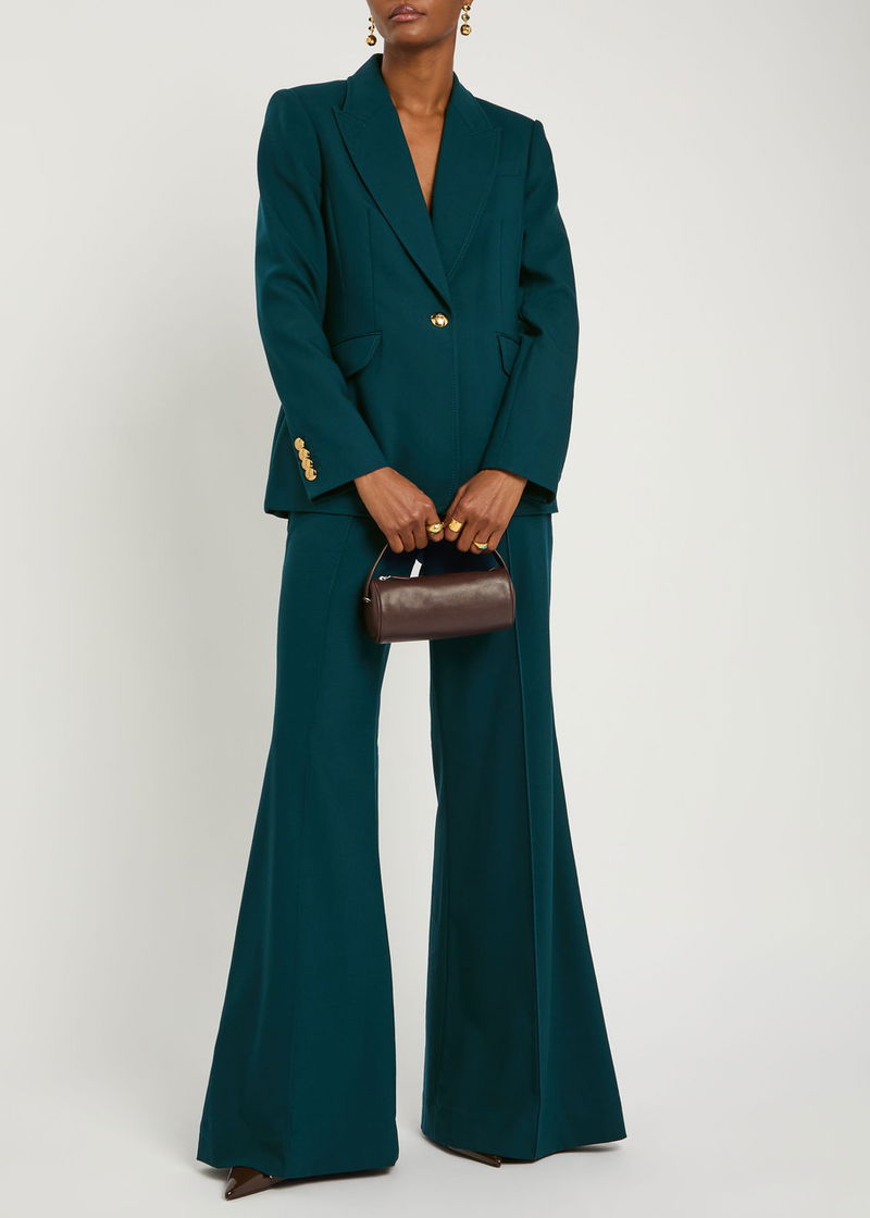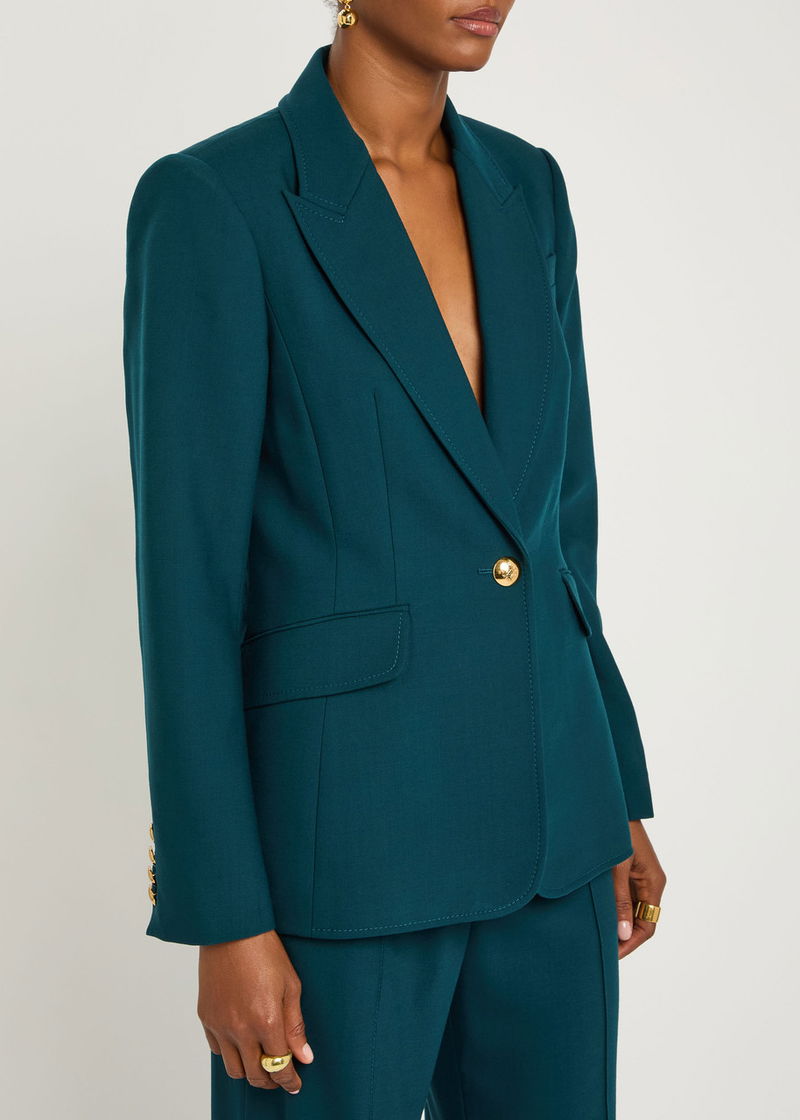• Peaked lapels, padded shoulders, faux button-fastening cuffs, chest slit pocket, darts through waist, front flap pockets, back vent, internal button-fastening pocket, fully lined