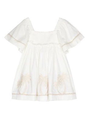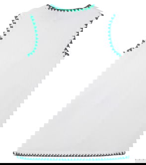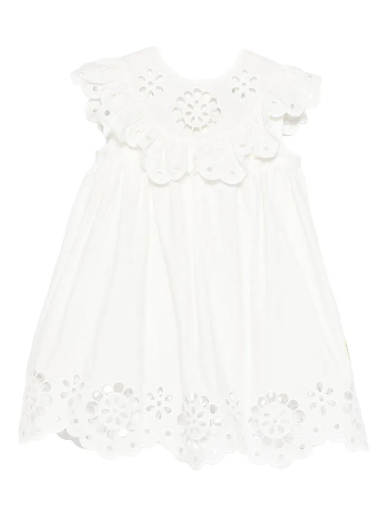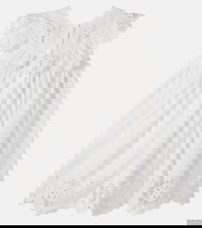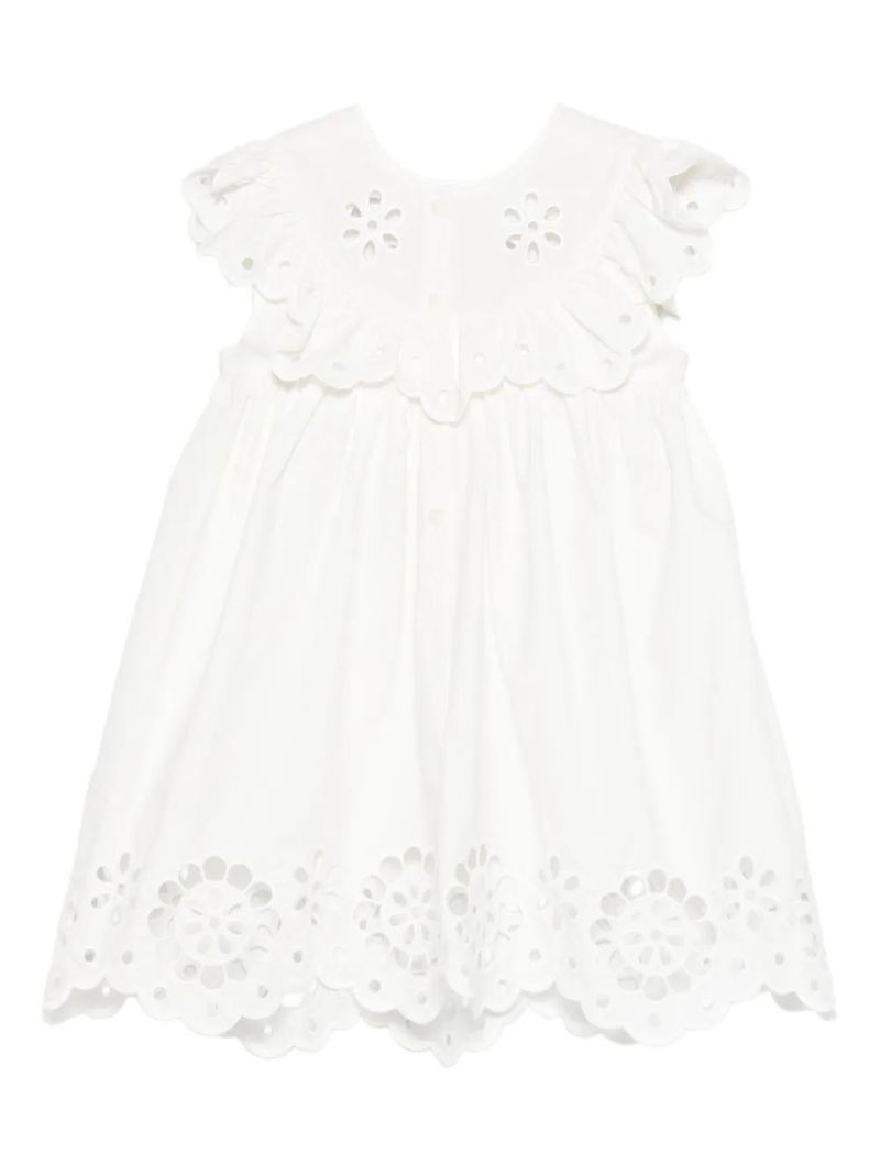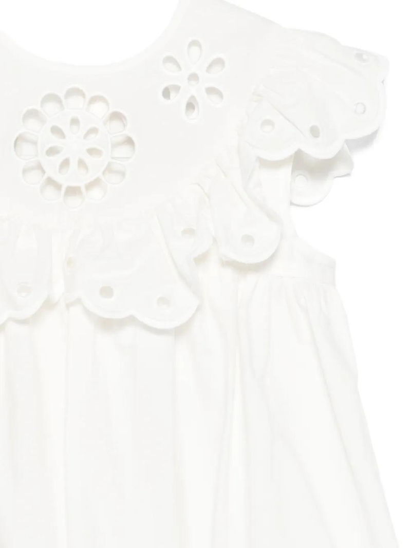 White, eyelet detail, floral detail, ruffled trim, short sleeves, button fastening.