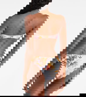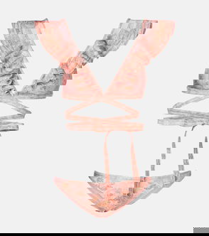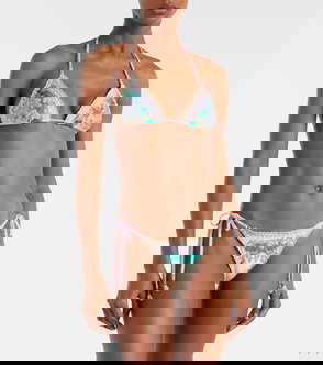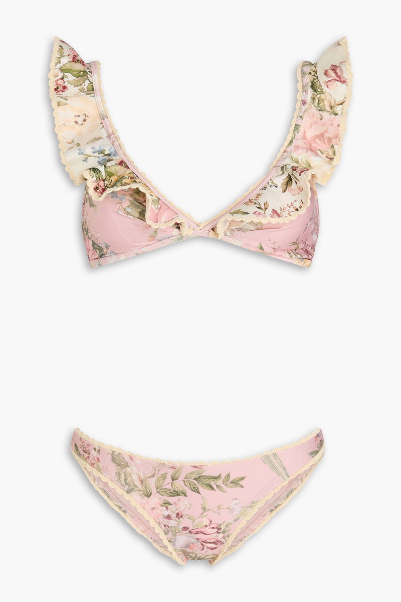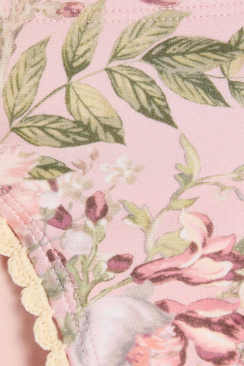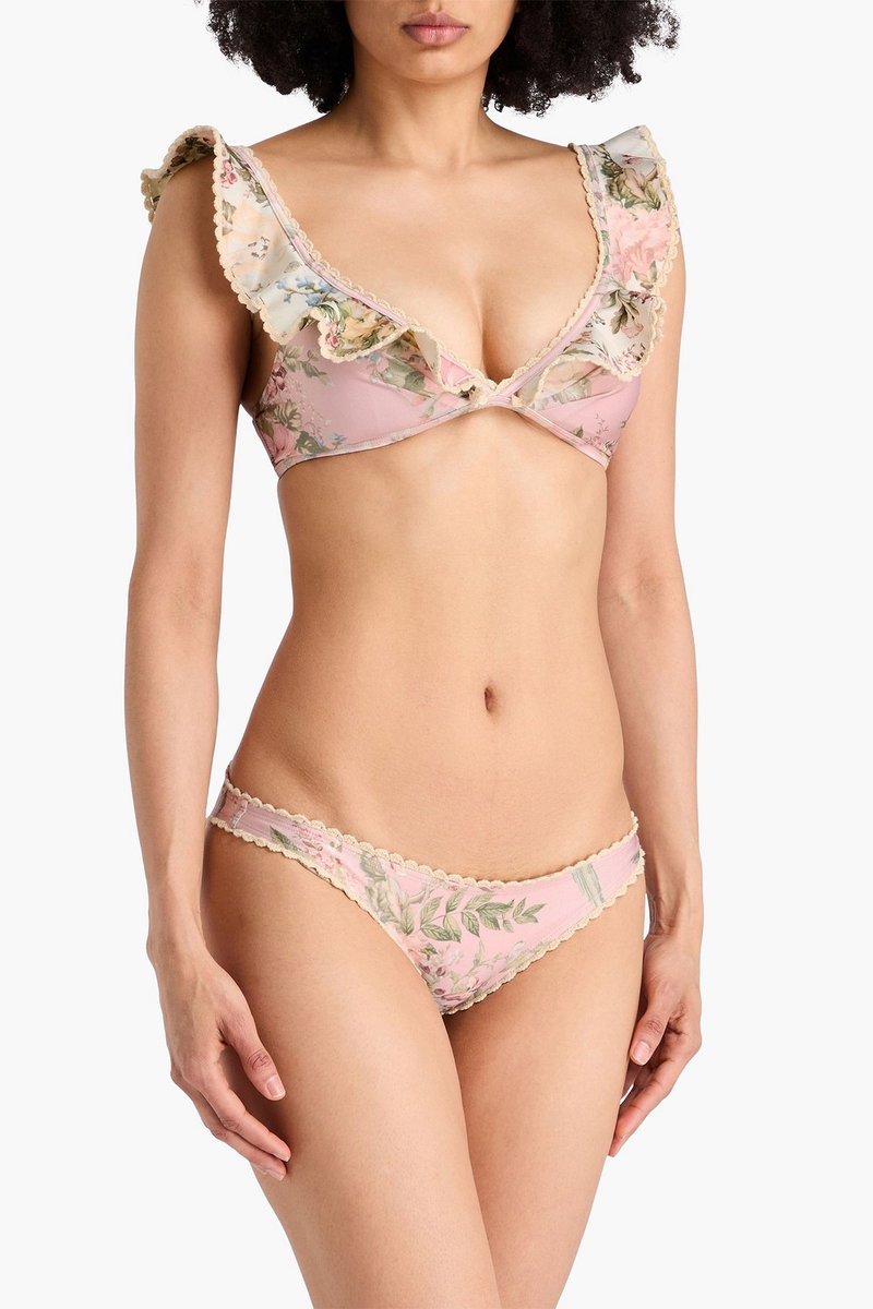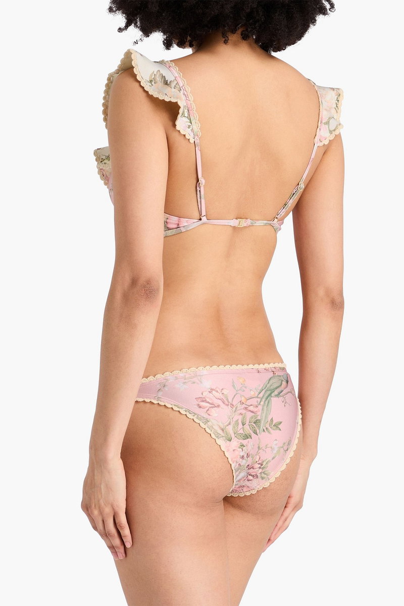 Bikini, Removable padded cups, Floral-print, Stretch-polyamide, Ruffled, Adjustable straps, Scalloped trims, Mid-rise briefs, Hook fastening at back.