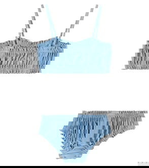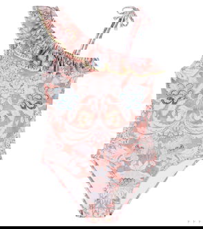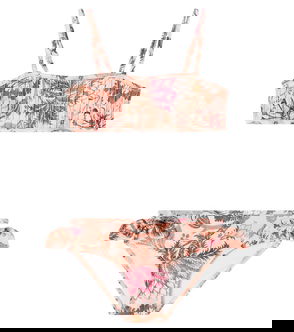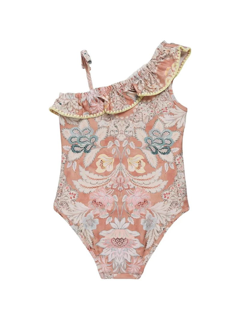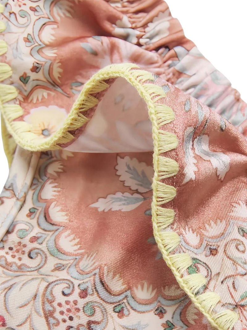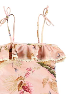 Floral print one-shoulder design ruffle trim shoulder strap.