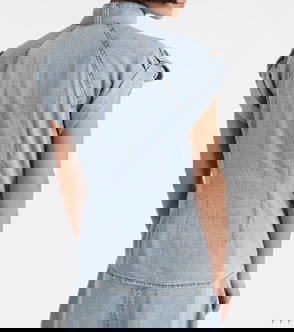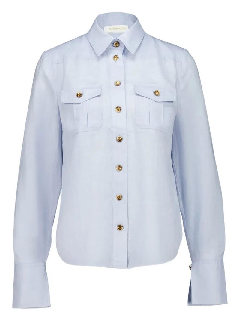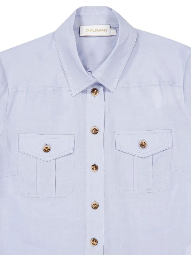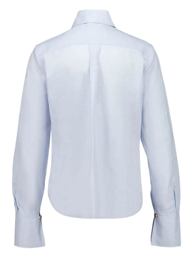 Pale blue chest pockets button fastening long sleeves buttoned cuffs asymmetric hem.