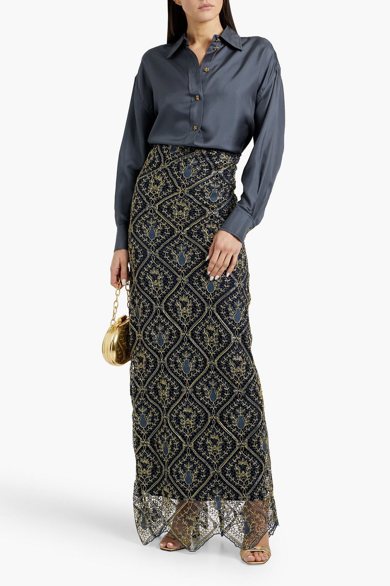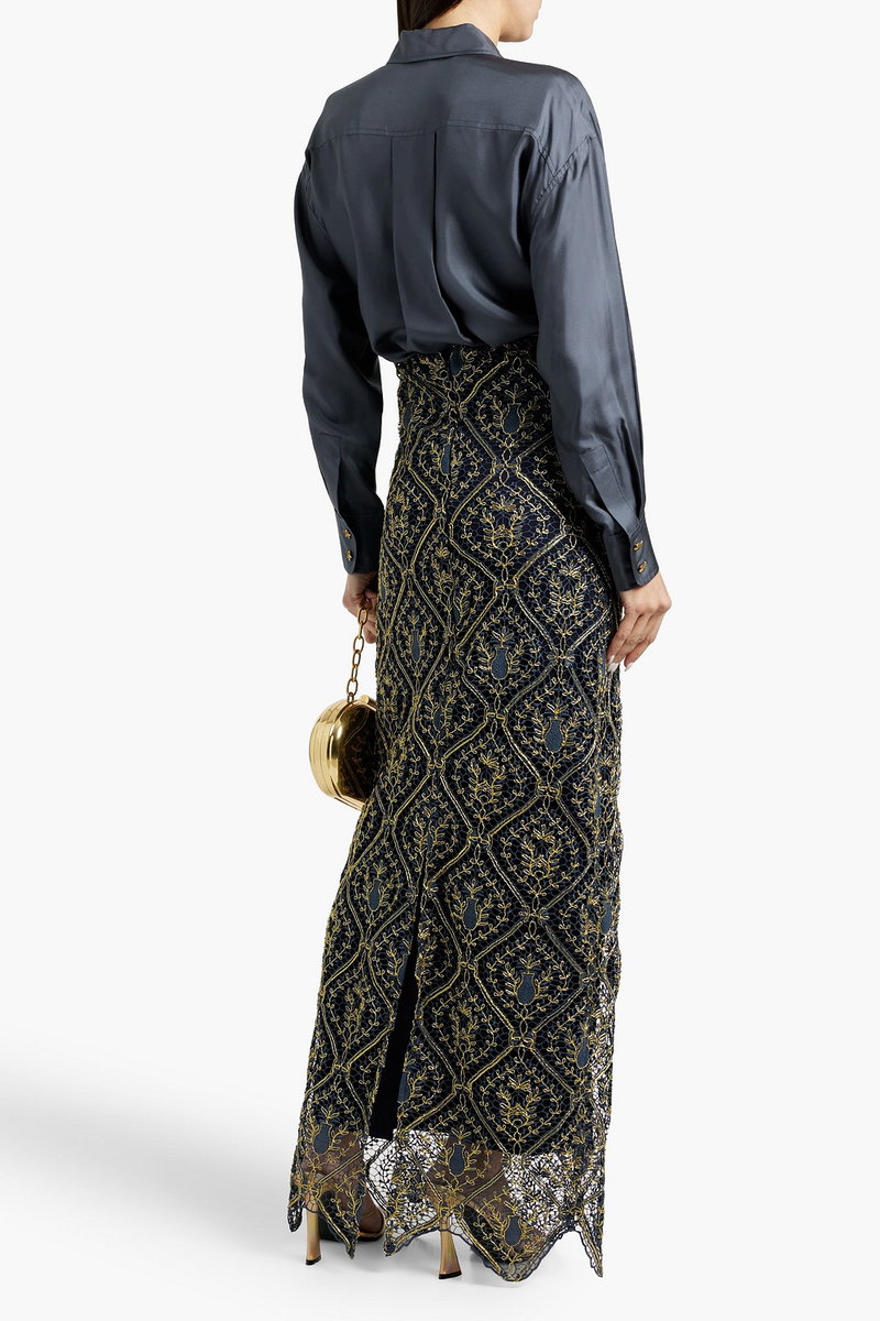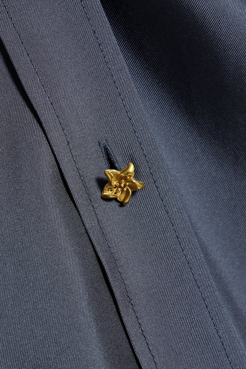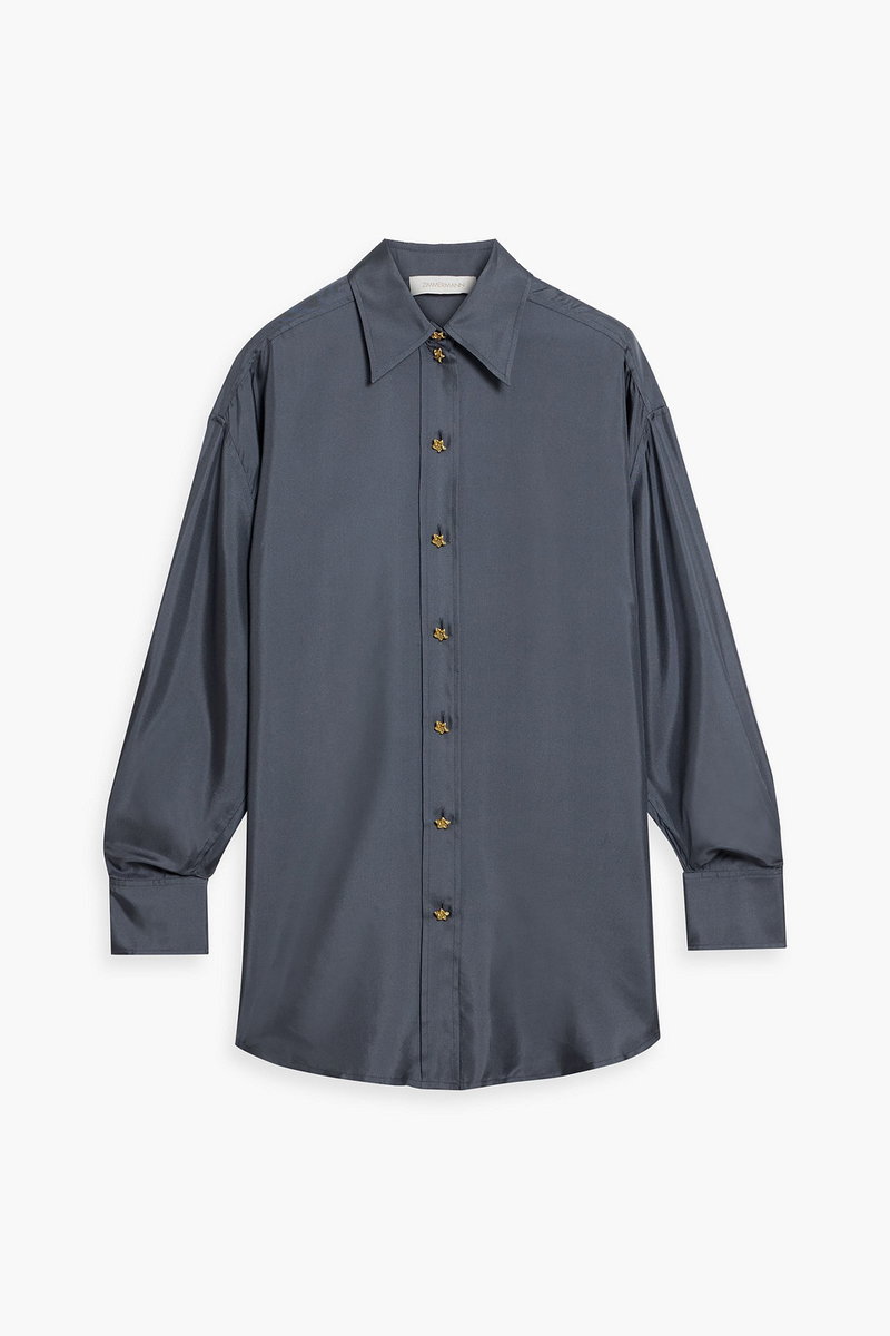 Shirt, Silk-twill, Pleated back, Buttoned cuffs, Curved hem, Button fastenings through front, Mid-weight, non-stretchy fabric.