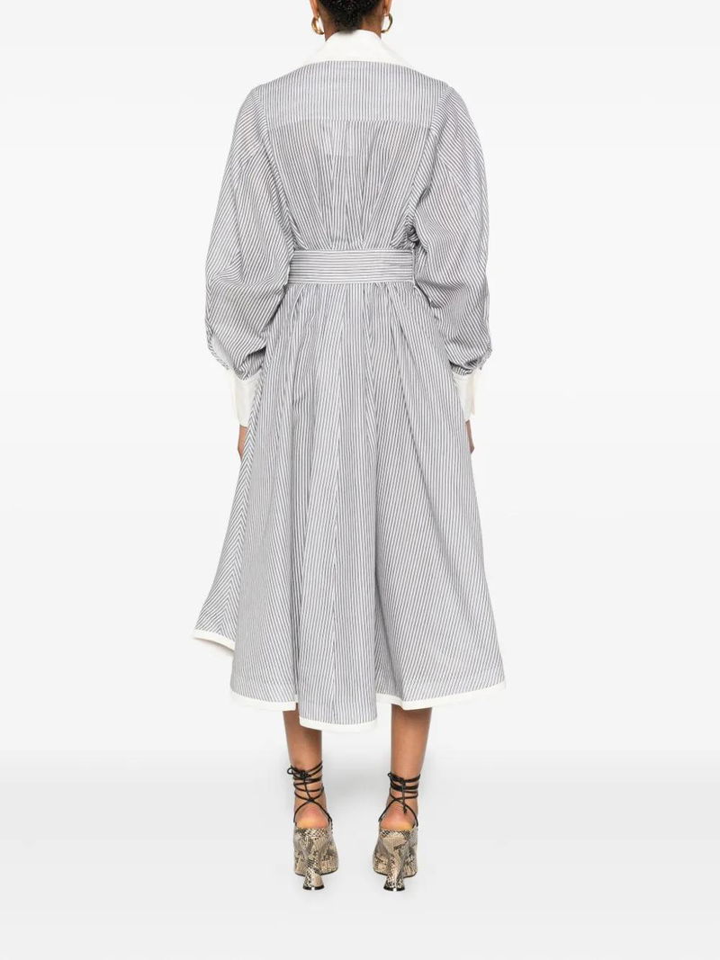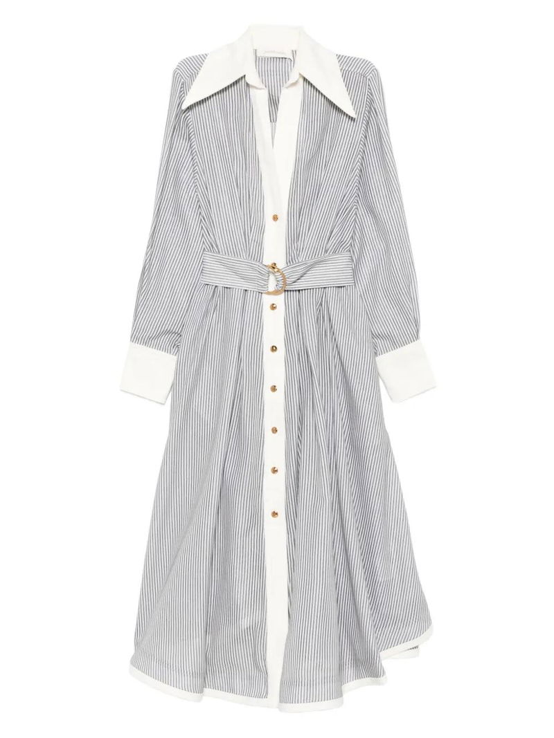 Navy blue white stripes button fastening belted waist long sleeves.