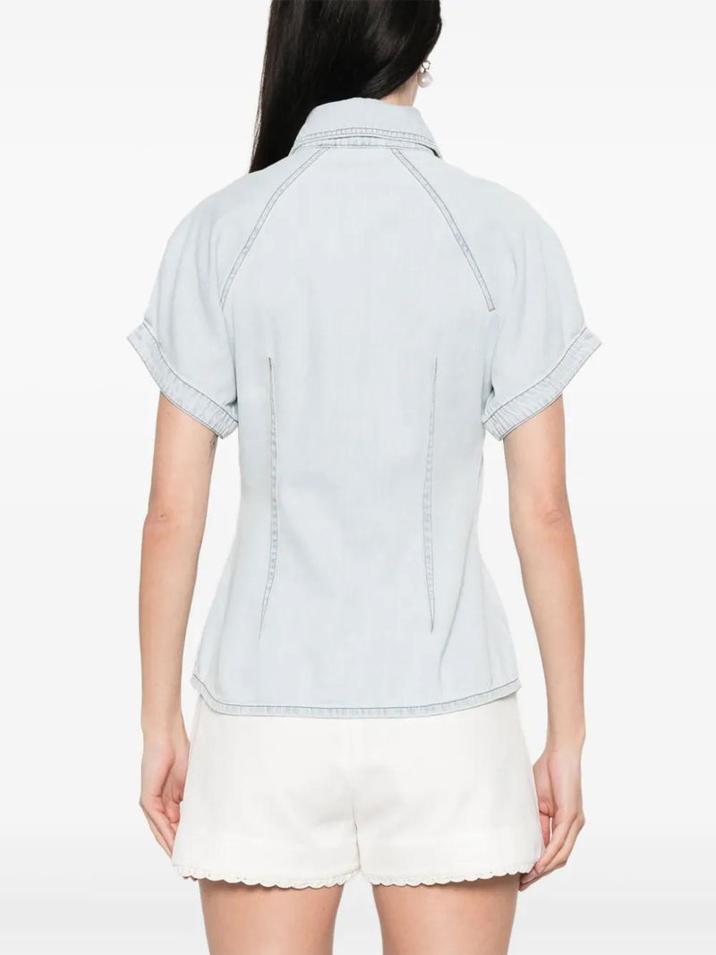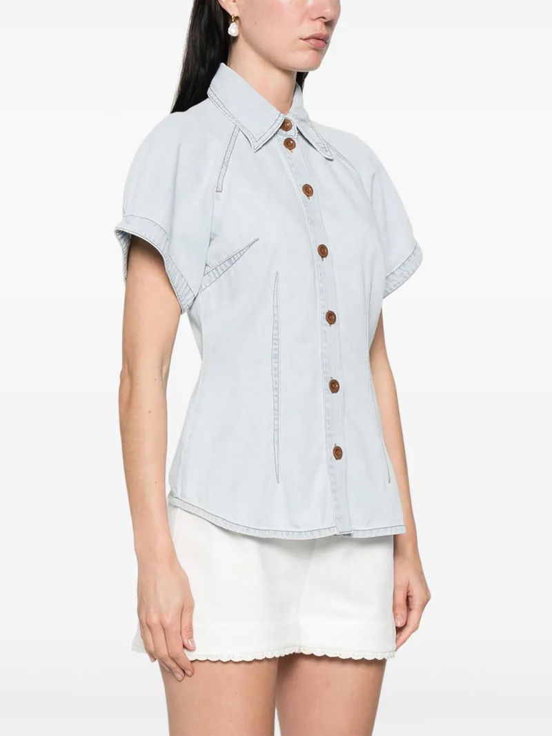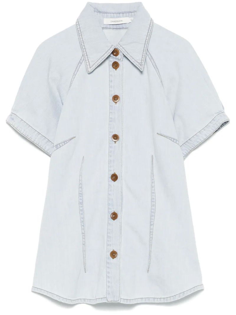 Light blue, front button fastening, dart detailing, inverted pleat, curved hem.