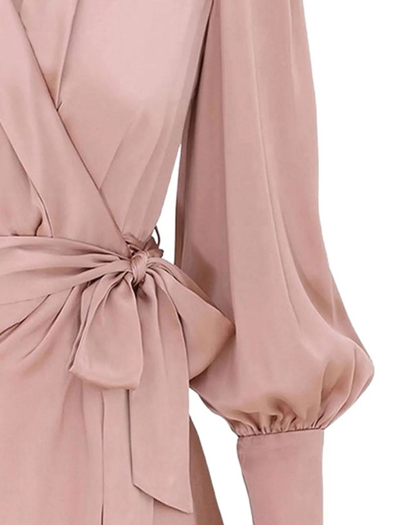 Dusty rose V-neck wrap bodice tie waist ruffle hem.