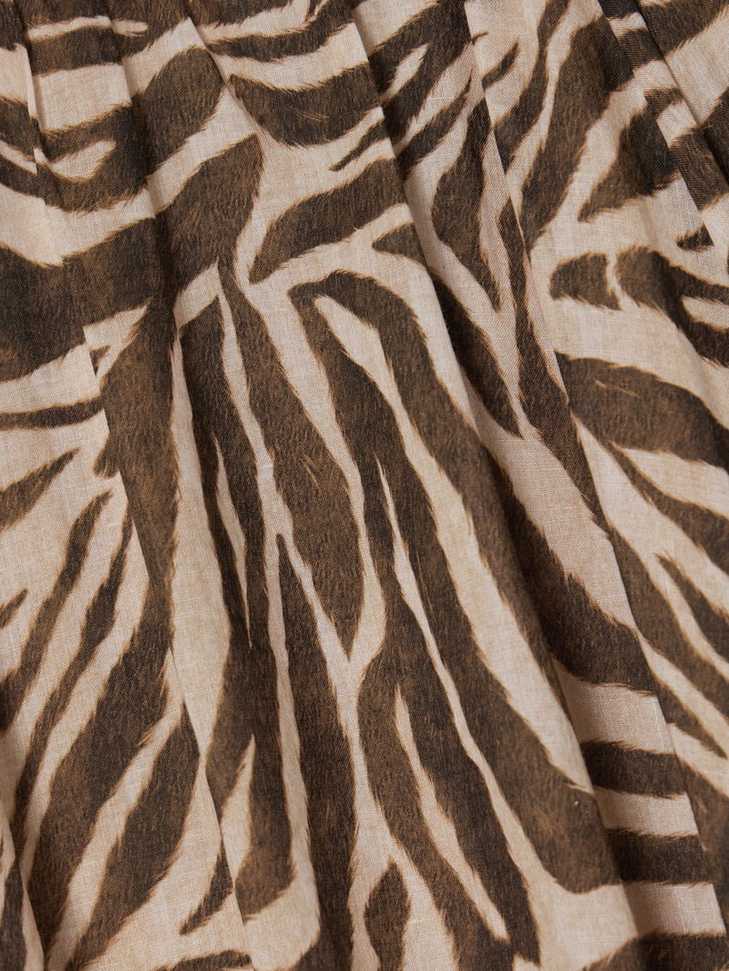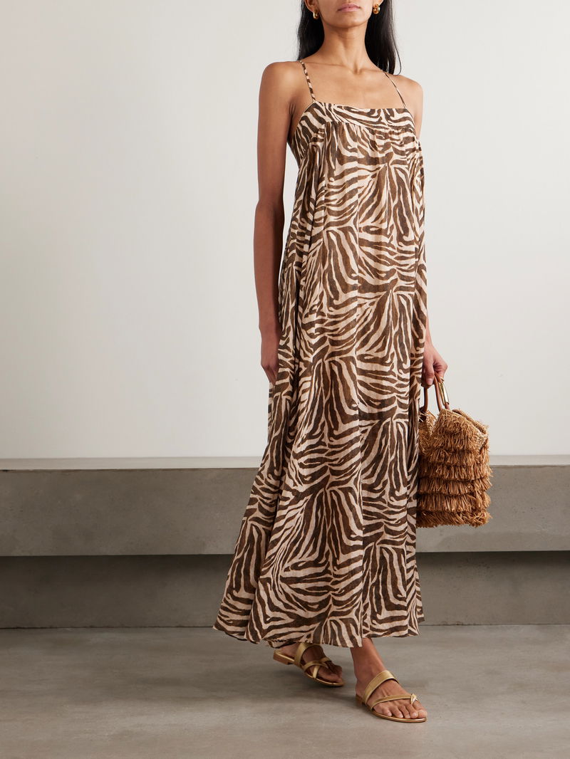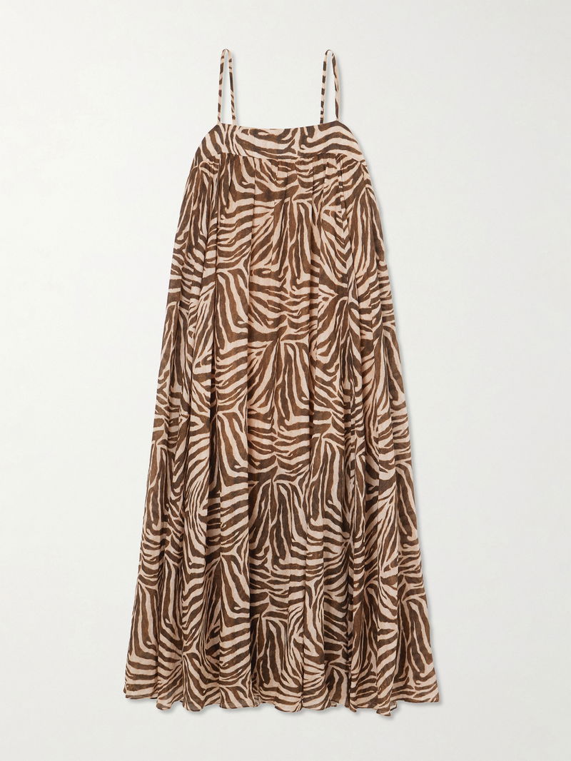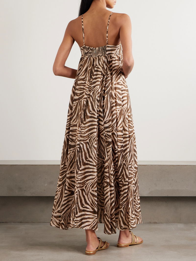 Wanderlust Gathered Zebra-print Cotton Maxi Dress