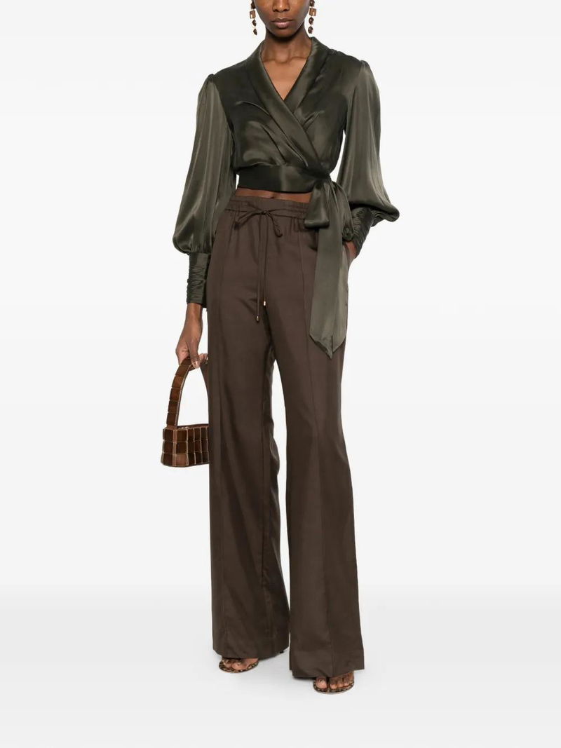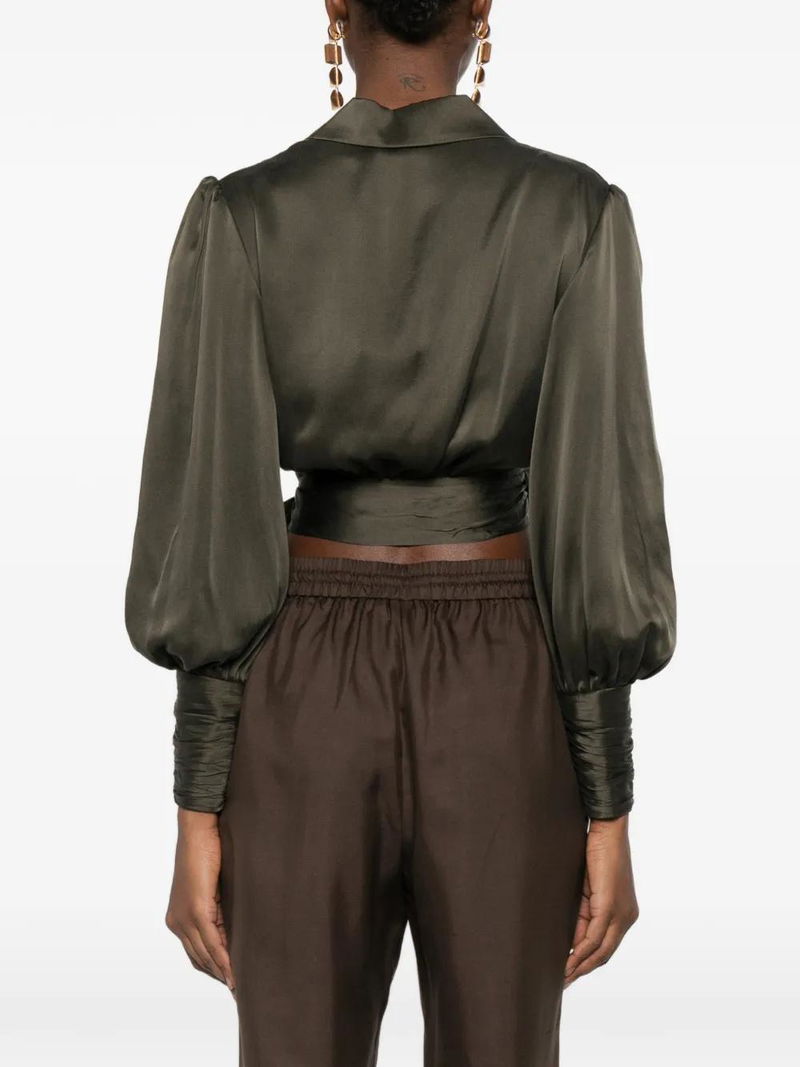 Green, wrap design, long sleeves, tie fastening cuffs.