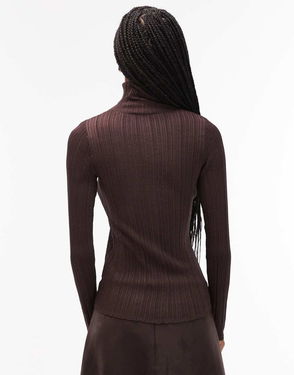 Metallic Knitted Rib Top With Roll Neck In Brown