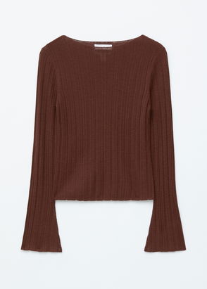 Pure Wool Lettuce Edge Long Sleeve Top With Thumbhole Detail In Brown