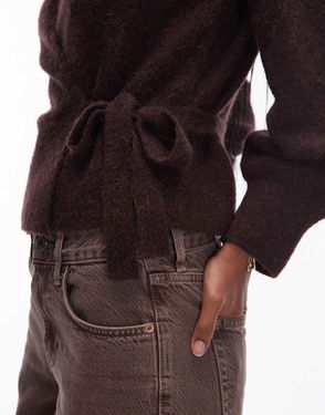 Mohair And Wool Hairy Yarn Wrap Cardigan With Puff Sleeves In Brown