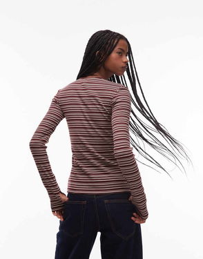 Rich Cotton Long Sleeve Top With Thumb Holes In Brown Stripe