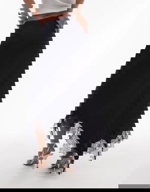 Satin Maxi Skirt With Asymmetric Lace Trim Hem In Light Brown