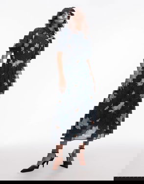 Puff Sleeves Midi Dress With Shirred Bodice In Bold Flower Print