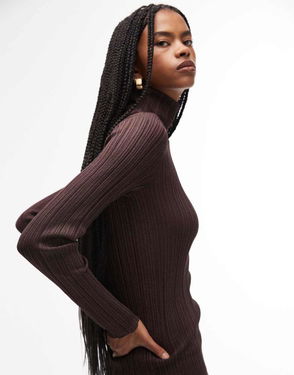 Metallic Knitted Rib Top With Roll Neck In Brown