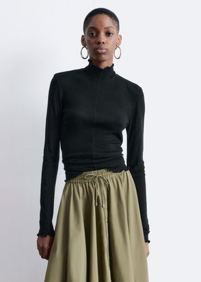 Wool Knitted Rib Funnel Neck Sweater With Split Back Neck And Volume Sleeves In Olive Green