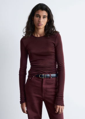 Pure Wool Lettuce Edge Long Sleeve Top With Thumbhole Detail In Burgundy Wine