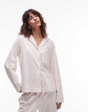 Mix And Match Cotton Long Sleeve Button Up Pyjama Top With White Contrast Piping In Beige