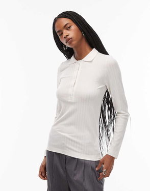 Stretch Jersey Rib Long Sleeve Polo Top In White