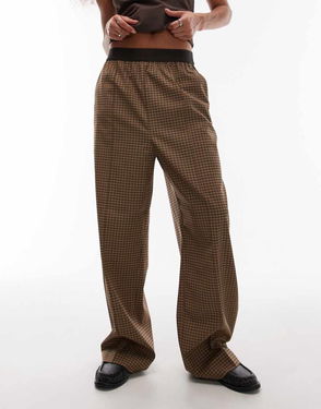 Wool Blend Stretch Straight Leg Trousers With Elasticated Waist In Light Brown Checks