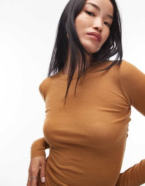Merino Wool Knit Semi Sheer Long Sleeve Top In Mustard