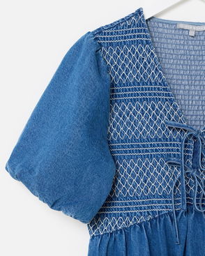Blue Denim Tie Front Puff Sleeve Midi Dress
