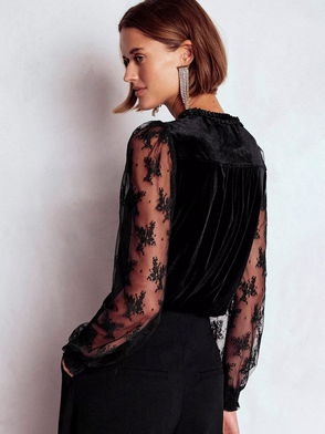 Lace Tie Neck Top, Black