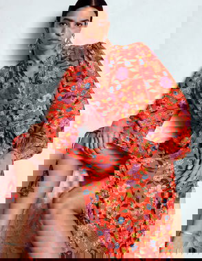 Ruffle Seamed Midi Dress-Poppy Red, Dainty Sprigs