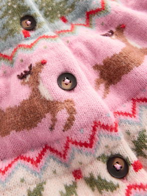Edie Fair Isle Reindeers Wool Blend Cardigan, Pink