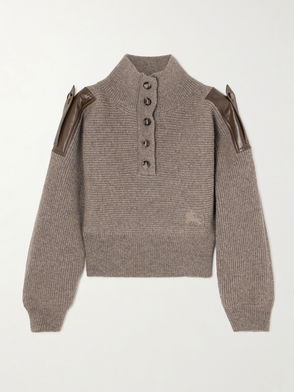 Leather-Trimmed Ribbed Wool Polo Sweater