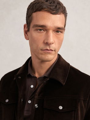 Velvet Press-Stud Trucker Jacket In Chocolate Brown