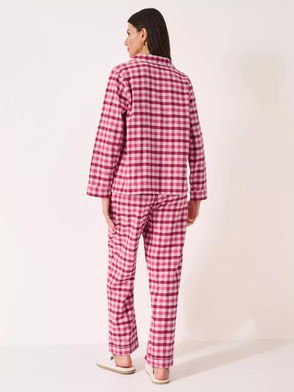 Flannel Check Button Through Long Pyjama Set, Multi Pink