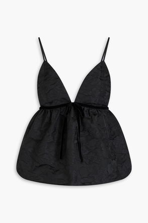 Bow-detailed Ruffled Metallic Gingham Jacquard Top