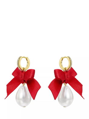 Riyya Ribbon Bow Pearl Drop Huggie Earrings, Gold/Ruby