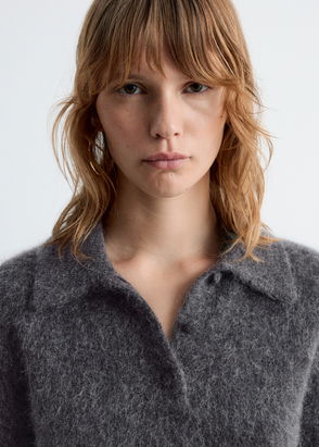 Knitted Semi Sheer Polo Top With Fluted Collar In Dark Grey