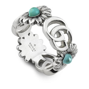Argento 925, Mother Of Pearl, Blue Topaz, Resin - Ring With Double G And Flower Motif In Shiny Aged