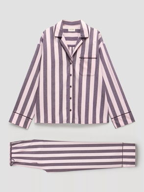 Stripe Brushed Cotton Button Through Long Pyjama Set, Purple/Pale Pink