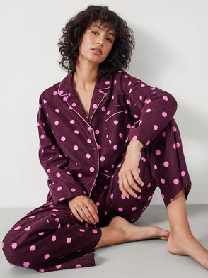 Amita Polka Dot Button Through Long Pyjama Set, Purple/Pink