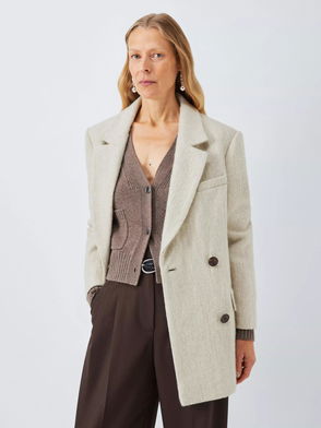 Double Breasted Wool Blend Herringbone Blazer, Cream