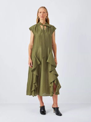 Sleeveless Textured Tie Neck Ruffle Midi Dress Containing TENCEL™ Lyocell, Khaki