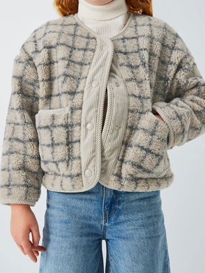 Kids' Check Borg Fleece Jacket, Cream, Grey