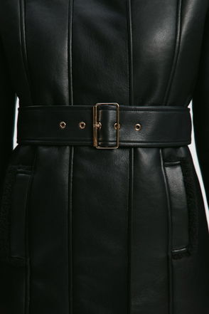 Faux Fur Buckle Detail Belted Biker Midi Coat